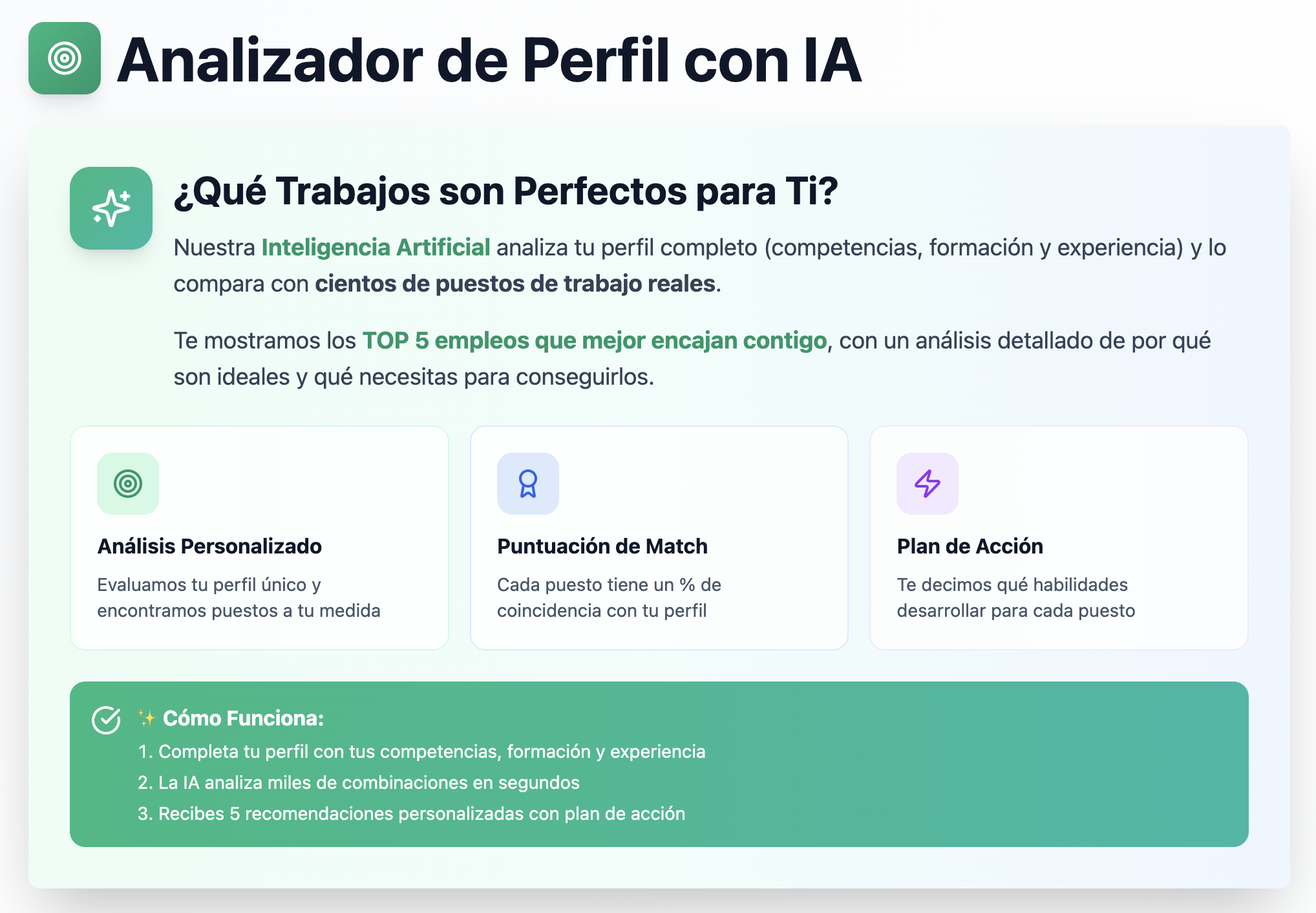 🔎 Analizador de Perfil con IA: descubre qué trabajos son perfectos para ti Nuestra inteligencia artificial evalúa tus competencias, formación y experiencia para recomendarte los TOP 5 empleos que mejor encajan contigo, con puntuación de match y un plan de acción para conseguirlos. Si no sabes por dónde empezar tu […]