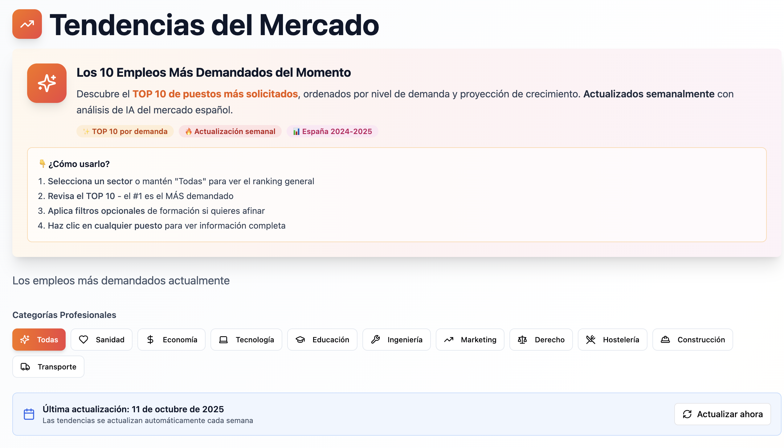 📈 Tendencias del Mercado: los 10 empleos más demandados del momento Ranking actualizado semanalmente con análisis de IA del mercado laboral en España (2024–2025). Consulta el TOP 10 por demanda, filtra por sectores y abre cada puesto para ver detalles y requisitos. En Educaclick.com lanzamos la nueva sección Tendencias del […]