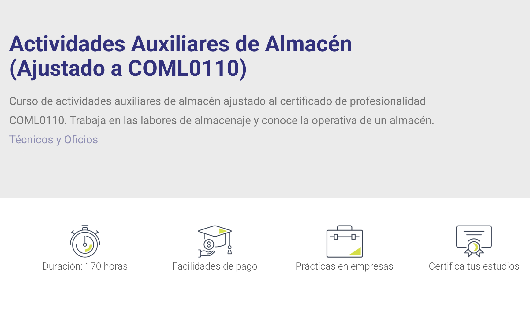 La formación está ajustada al Certificado de Profesionalidad COML0110 Actividades Auxiliares de Almacén, lo que te permitirá adquirir una base sólida y actualizada en logística y almacenamiento.