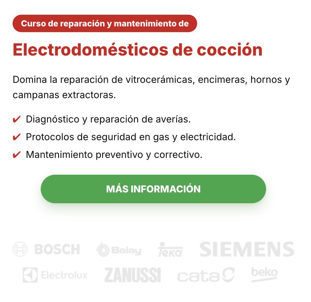 El Curso de Reparación y Mantenimiento de Electrodomésticos de Cocción está orientado a personas que desean formarse como técnicos especializados en uno de los servicios más habituales dentro de la reparación de electrodomésticos de gama blanca. La formación está enfocada a la intervención profesional en hornos, placas vitrocerámicas, encimeras de gas y campanas extractoras, equipos presentes en prácticamente todos los hogares.