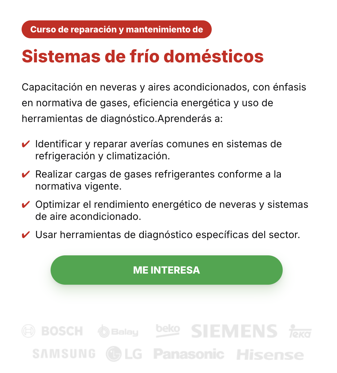 Este curso permite acceder a oportunidades laborales en reparación de sistemas de frío domésticos, servicios técnicos y mantenimiento. Es una opción muy valorada tanto para iniciarse como para especializarse en refrigeración.
