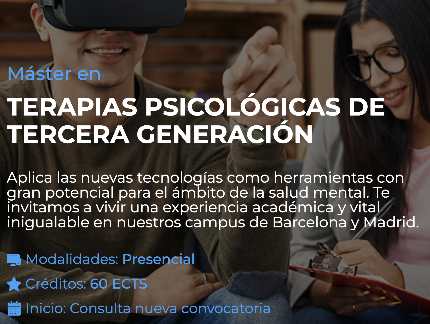 El Máster en Terapias Psicológicas de Tercera Generación es una formación avanzada dirigida a profesionales de la salud mental que desean especializarse en los enfoques terapéuticos más innovadores y eficaces del momento. Este programa integra las terapias contextuales con el uso de nuevas tecnologías, ofreciendo herramientas clínicas actuales para abordar trastornos psicológicos desde una perspectiva flexible, científica y centrada en la persona.
