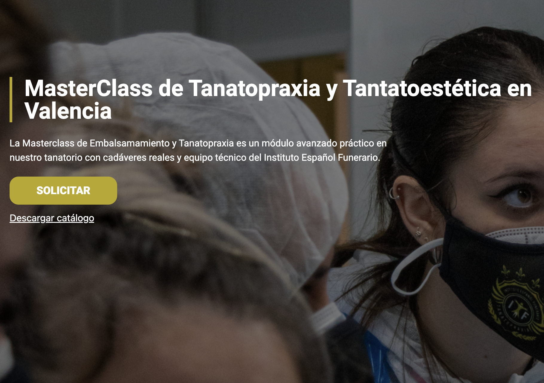 La MasterClass de Tanatopraxia y Tanatoestética en Valencia es una experiencia formativa intensiva que se desarrolla directamente en un tanatorio real. A lo largo de las sesiones trabajarás con material profesional y cadáveres reales, aprendiendo de la mano del equipo docente del Instituto Español Funerario. Una formación única que aporta práctica, realismo y un conocimiento técnico difícil de encontrar en otros programas.